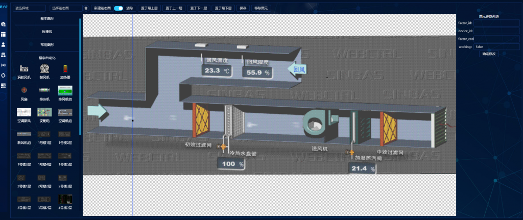 通過搭建組態(tài)環(huán)境,與現(xiàn)實(shí)采集設(shè)備進(jìn)行邏輯關(guān)聯(lián),結(jié)合三維地圖,將工業(yè)生產(chǎn)過程直觀的展現(xiàn)給用戶,通過設(shè)計(jì)相關(guān)工業(yè)生產(chǎn)邏輯規(guī)范,及預(yù)警參數(shù),能夠?qū)崟r(shí)進(jìn)行監(jiān)控展示,對(duì)于異常情況能夠第一時(shí)間展示在基于三維的自動(dòng)控制系統(tǒng)中。